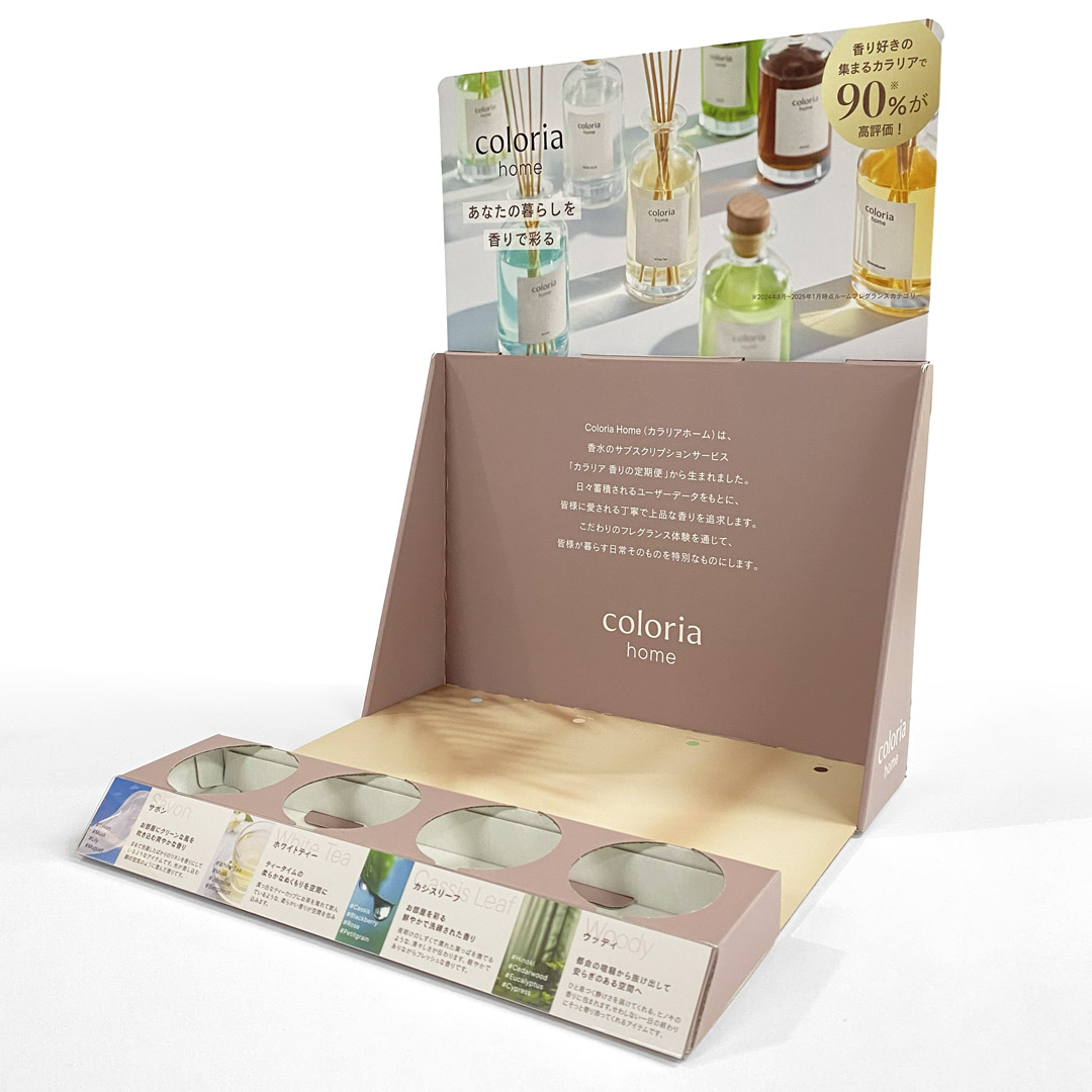 初めに「ご予算」と「陳列数量」をお聞きし、ご要望に合う「素材」・「形状」・「展開方法」をご提案させていただきました。什器を2台に分けることで、店舗様の陳列スペースに合わせた展開を可能にしております。表面加工はマットPPを使用し、高級感を持たせつつ、やわらかいイメージに仕上がりました。